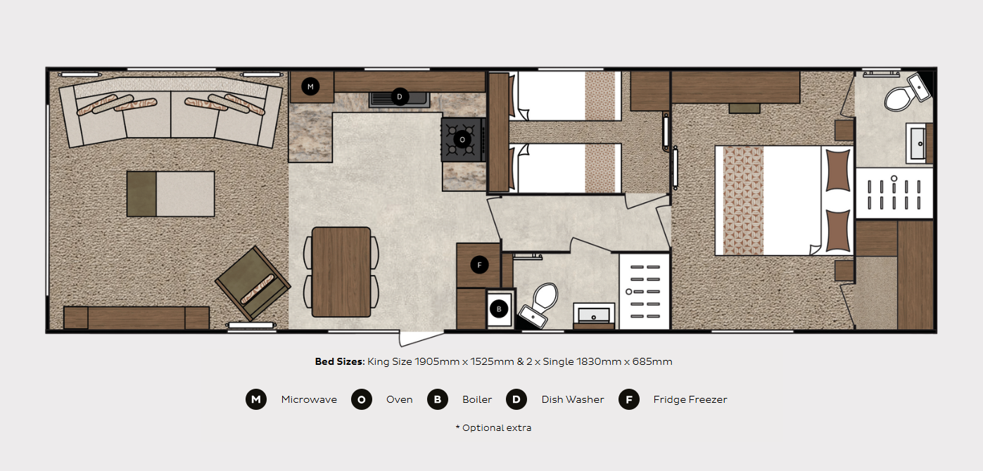 CarringtonA New Era Of Carnaby Design Step inside the brand-new Carrington and discover a holiday home designed for light, space and modern comfort. Panoramic windows and vaulted ceilings create a bright, airy lounge, while the open-plan layout flows effortlessly into a stylish walnut and pebble grey kitchen - a thoughtful new addition to the Carnaby range. StylingThe Carrington's lounge blends contemporary style with everyday comfort. Sink into the sumptuous shaped sofa, relax in the accent armchair, or put your feet up on the storage footstool as natural light floods the space through panoramic windows. Roman blinds with matching fabric pelmets and elegant silver-finish wall lights add subtle luxury and finishing touches throughout. FeaturesStandard Features