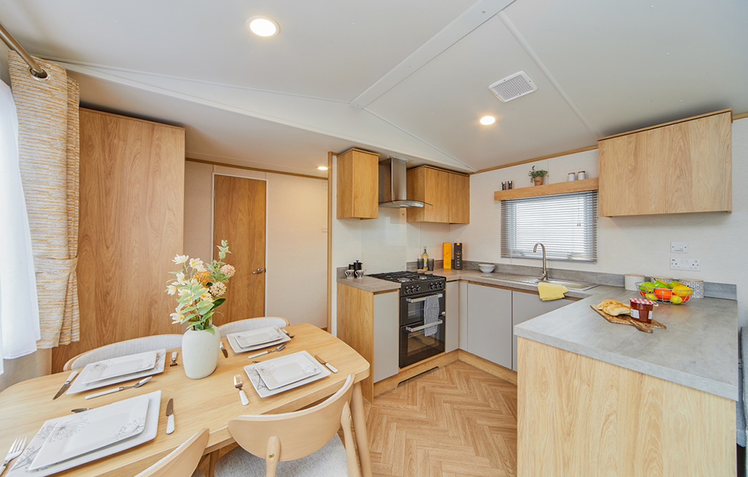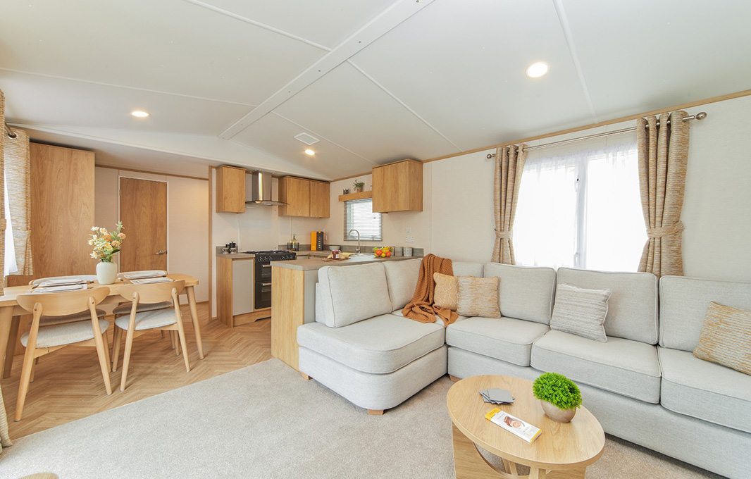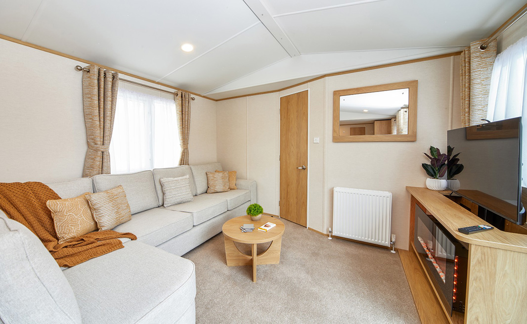 Melrose Centre LoungeCentral Living, Balanced Design. The Melrose Centre Lounge layout places the living area at the heart of the Melrose, creating a bright and welcoming hub for family living and entertaining. With bedrooms at either end, it balances shared spaces with privacy, making it a versatile option for every lifestyle. StylingSoft neutral tones and golden oak accents remain at the core of the Melrose design, while the central living space brings an exciting new dynamic. A cosy wraparound sofa and flame effect fire make the lounge the natural hub of the home - perfect for fun-filled family evenings. FeaturesStandard Features