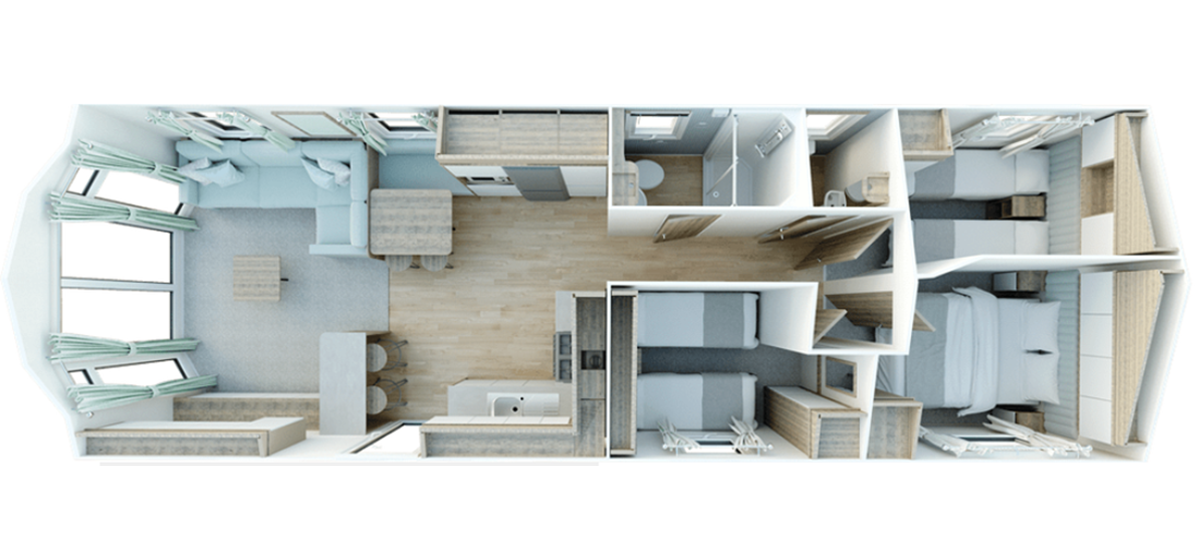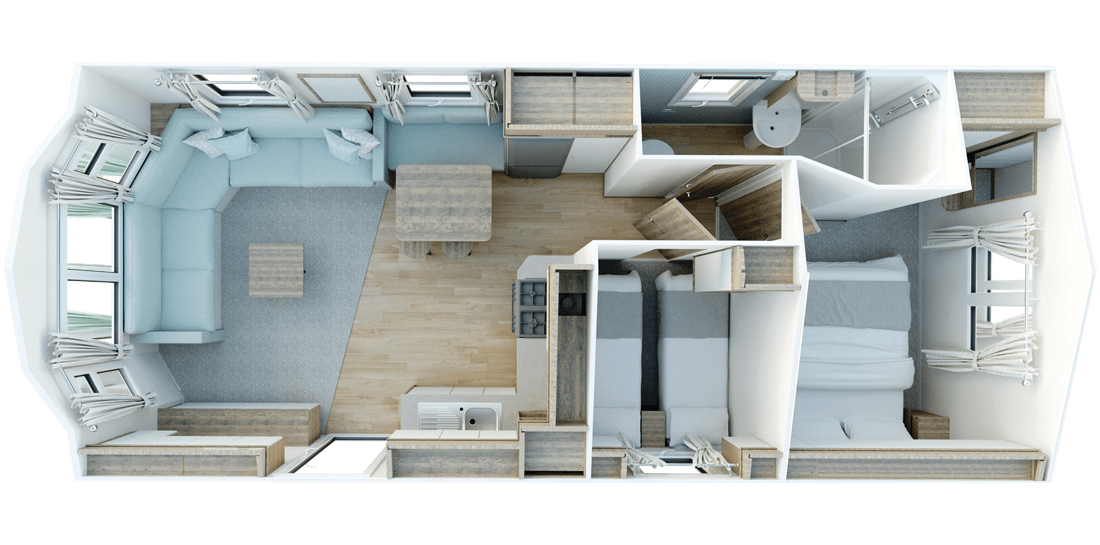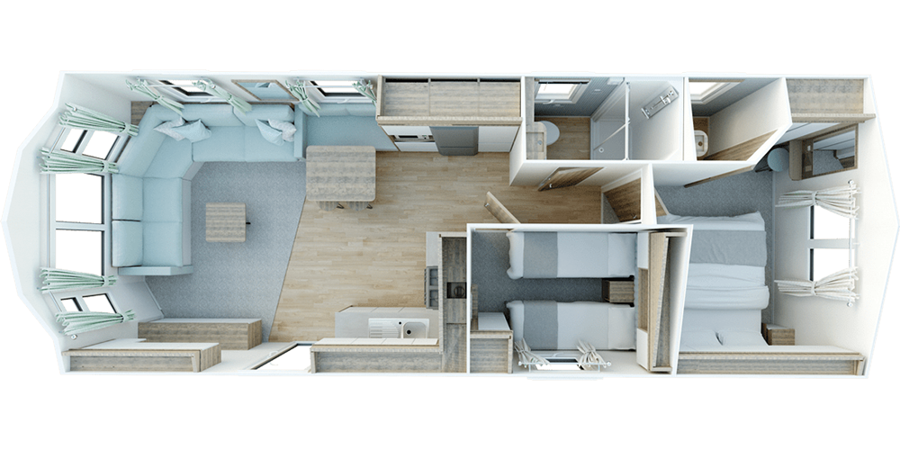 BrookwoodThe Brookwood is all about socialising. It’s built around a big, open kitchen diner where you can relax and chat while you prepare a home-cooked meal or enjoy a takeaway. The first thing you’ll spot on the Brookwood is the big bay window at the front. It looks great and lets plenty of light into the lounge. On the larger, 35’ and above models is even stretches all the way from the floor to the ceiling. There’s even the option to have a sliding patio door, if you have one of the bigger models. A great way to take full advantage of those views. The Brookwood also comes in a range of sizes - from 28’ x 12’ right up to a massive 40’ x 12’, to make the most of your pitch, whatever size it is. The Brookwood is made for entertaining. . So, there’s plenty of room in the cosy lounge to hang out with your friends and family. The fitted sofas have lots of room for people to sit, and leave lots of space for the kids to play on the floor. Included as standard