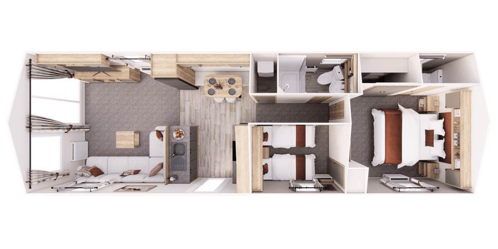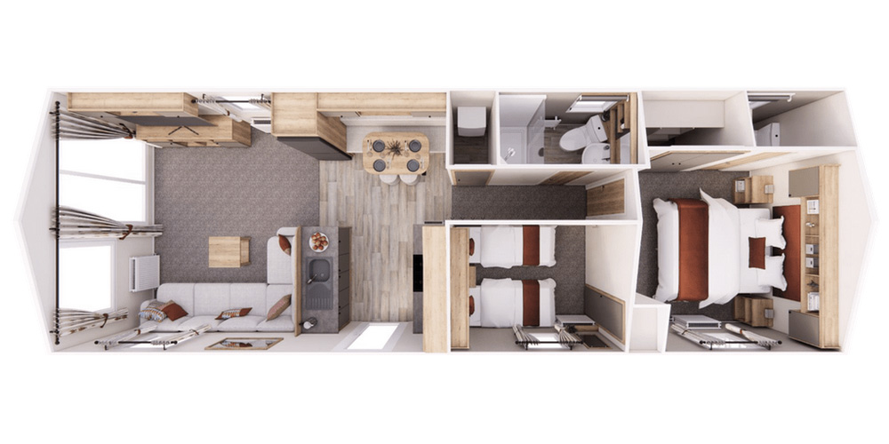 RioThe distinctive layout of the Rio allows you to step straight into the heart of the home - the kitchen, with the kettle just an arms reach away. With a cup of tea brewing, it's time to drop those bags and head straight to the comfy L-shaped sofa in the lounge where your vacation truly begins. Cleverly designed storage features heavily throughout the Rio, from the underseat storage in the lounge and smart stowing space beneath the dinette bench, to the large cupboard in the hallway and generous built-in wardrobes in the bedrooms. You will never be short of space so you can bring all that you need and more. Although the Rio is pitched as one of our latest entry-level holiday homes, it certainly doesn't lack style! Its bold interior design scheme features fun and vibrant pops of colour and pattern throughout over a contemporary and grown-up base palette, making the home feel much more expensive than it is. The kitchen is perfectly placed to make the most out of the space in the Rio. Enter your holiday home and find yourself at an arm reach away from popping the kettle on as you find yourself the heart of the home. Included as standard