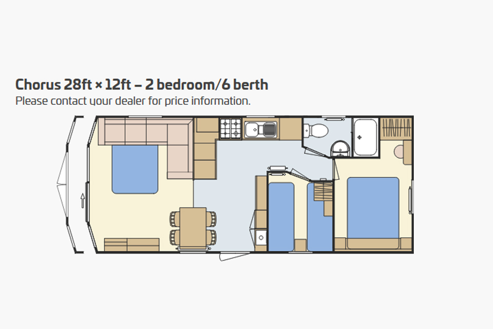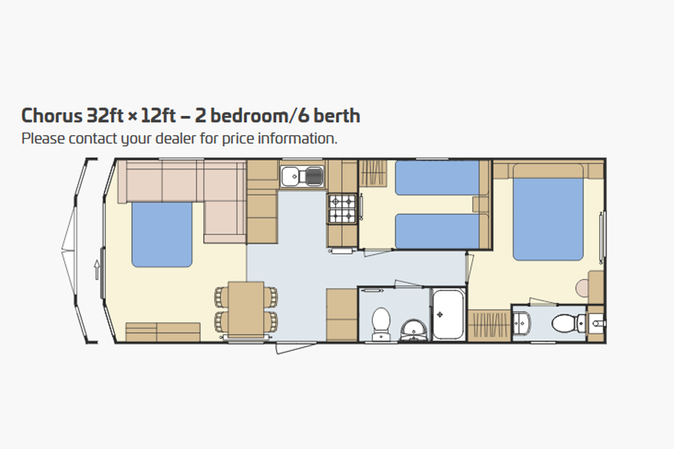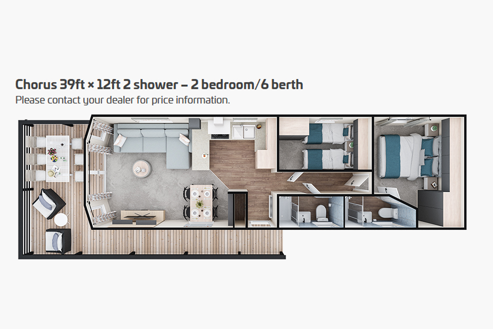 ChorusThe Chorus 7 is a perennial favourite with its open plan living area featuring elegant L-shaped sofa with armrest featuring USB charging socket, light wood wall panels and furniture with stylish grey drawer fronts and modern electric fire. The adjoining dining area has a freestanding light wood table top with black metal legs and coordinating black wood dining chairs. This space is separated from the entrance by a built-in shelving unit. The fitted kitchen in the Chorus 7 is stunning. Its focal point is the copper coloured glass splash back with stainless steel and glass overhead vented extractor. There is an electric oven with grill, 4 ring gas hob and integrated fridge/freezer included as standard. The Chorus 7 illustrated is the 36ft x 12ft – 2 bedroom. It is shown here with light grey aluminium cladding and white PVC windows and doors and includes optional front French doors. Note: Deluxe bedding set, lounge scatters, TV and interior accessories are for display purposes only. The Chorus 7 master bedroom is truly stunning. The graphite built in wardrobes are complemented by matching overbed storage above the kingsize bed. A dressing table with tub style stool and feature strip lighting to the headboard complete a remarkable sleep space. The second bedroom also features graphite fitted furniture and twin beds. The Chorus 7 has room to sleep the whole family and store all those ‘essentials’ you need when you take that well deserved break. The Chorus 7 main bathroom has a large shower cubicle, wash basin with mirrored cabinet above, WC and extractor fan. With the exception of the 28ft model, all Chorus 7 holiday homes have an ensuite wash basin and WC to the master bedroom. The Chorus 7 comes complete with central heating, double glazing and extra insulation as standard to guarantee you’ll enjoy your time away whatever the weather has in store. Images