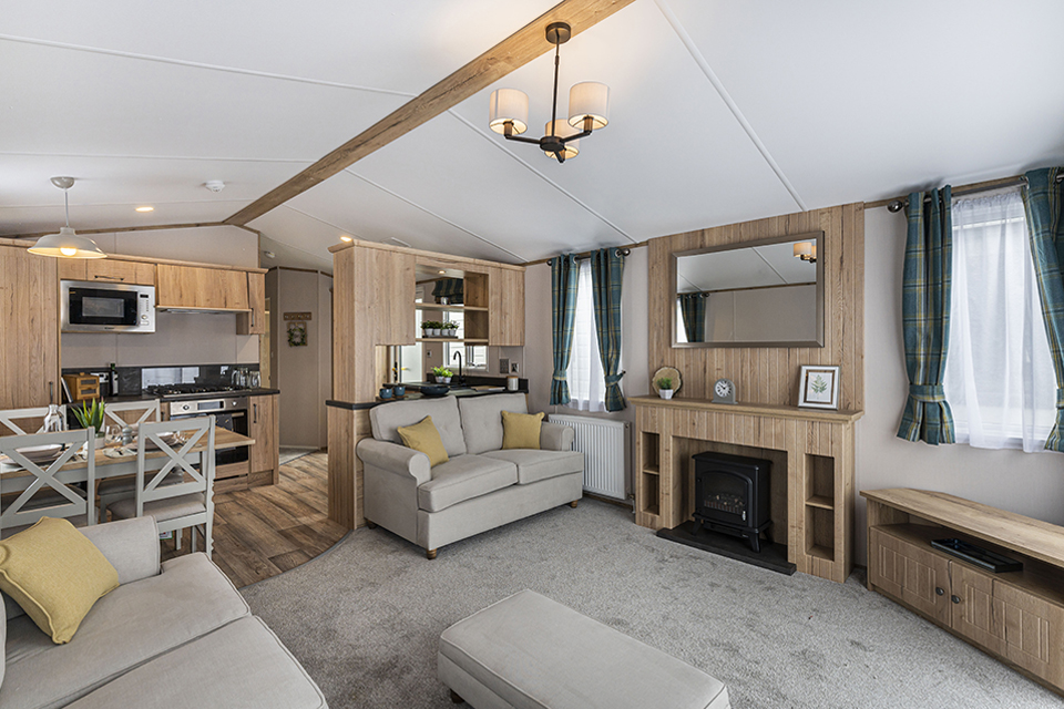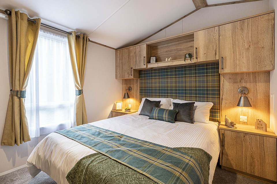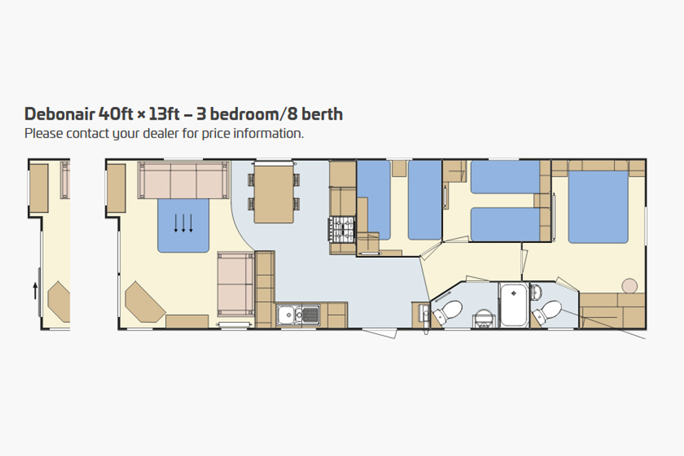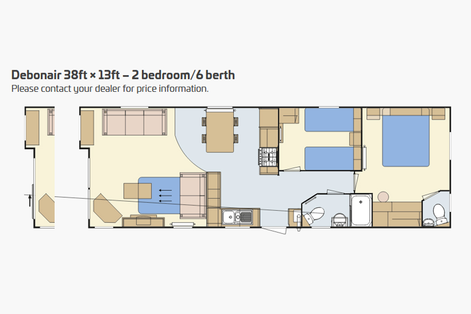 DebonairThe Debonair 10 interior is an epitome of country home living. The lounge has freestanding 2 and 3 seater settees with homely fabrics and contrasting stag and bolster cushions. The lounge also features a log-burner style electric fire in a traditional mantelpiece setting. The farmhouse style dining table is complemented by matching chairs which continue the country theme. The Debonair 10 has a fully fitted farmhouse- style kitchen benefiting from an integrated The kitchen units are a mixture of standard and glass fronted doors for an added touch of elegance. The Debonair 10 illustrated is the 38ft x 12ft. It has 2 bedrooms with light grey aluminium cladding and PVC windows and doors finished in white. Model illustrated also includes the optional sliding patio door. Note: Deluxe bedding set, TV and interior accessories are for display purposes only. The Debonair 10 master bedroom continues the traditional styling with beautiful built in furniture and kingsize bed. Light floods in to the bedroom through the large three- quarter height window and the bedroom is completed with ensuite comprising wash basin and WC. The second bedroom in the Debonair 10 features two single beds and a built in wardrobe with overbed storage. There is also a 3 bedroom model available giving extra sleeping options. The main shower room has a large shower cubicle, stylish countertop wash basin with storage cabinet below, WC and external extractor fan. The ensuite to the master bedroom has a wash basin with mirror above and WC. Due to its great popularity, there are now 7 variations of the Debonair 10 available. The 12ft and 13ft widths come in lengths between 36ft to 40ft including two exciting new twin shower configurations. Images